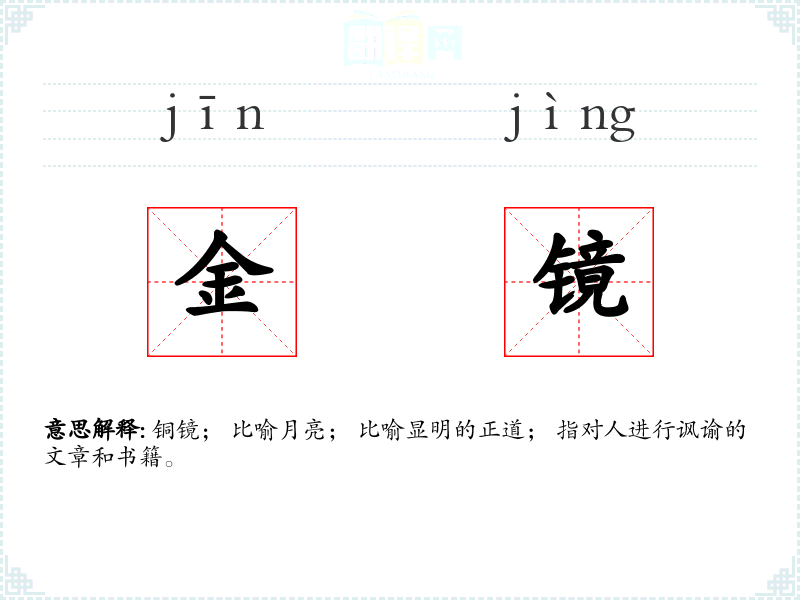 铜镜; 比喻月亮; 比喻显明的正道; 指对人进行讽谕的文章和书籍。
