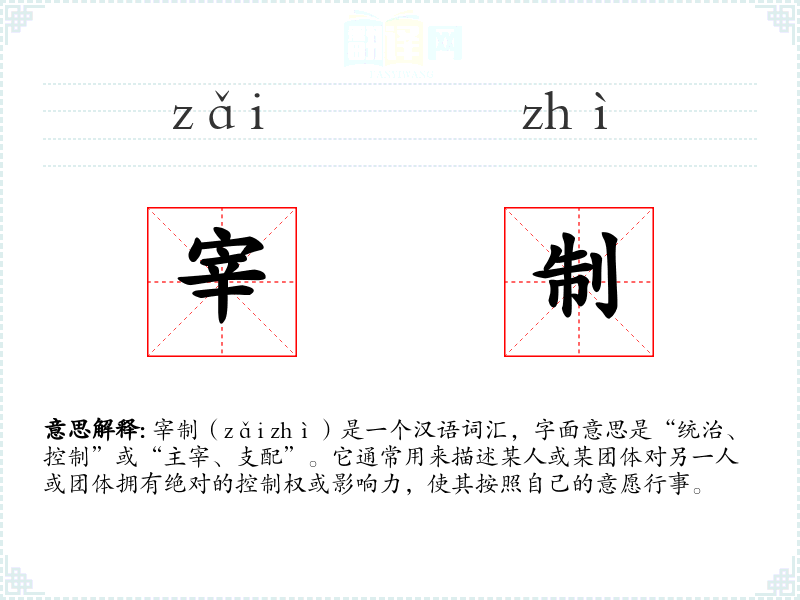 宰制(zǎi zhì)是一个汉语词汇,字面意思是“统治、控制”或“主宰、支配”。它通常用来描述某人或某团体对另一人或团体拥有绝对的控制权或影响力,使其按照自己的意愿行事。