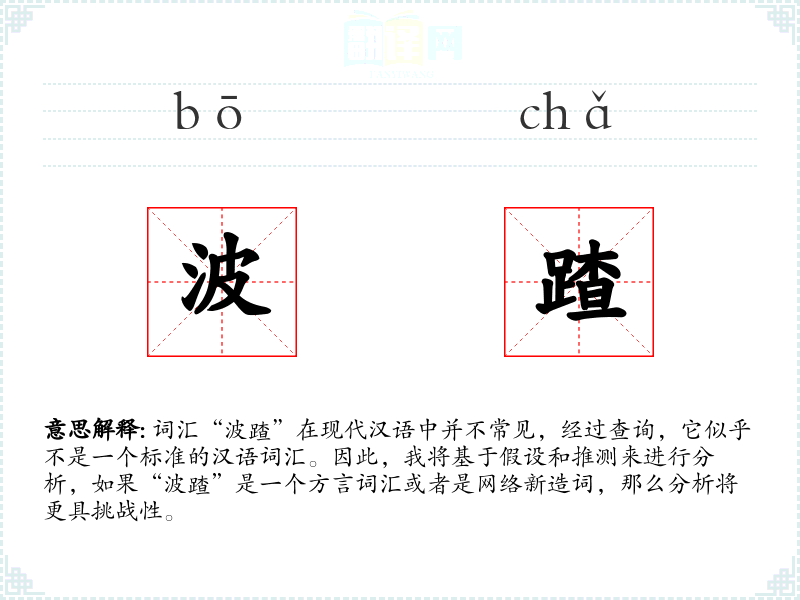 词汇“波蹅”在现代汉语中并不常见,经过查询,它似乎不是一个标准的汉语词汇。因此,我将基于假设和推测来进行分析,如果“波蹅”是一个方言词汇或者是网络新造词,那么分析将更具挑战性。