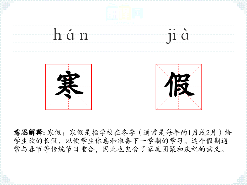 寒假一词由“寒”和“假”两个字组成。“寒”指的是寒冷的天气,“假”指的是休息的时间。这个词在中文中的使用历史悠久,特别是在教育领域,已经成为一个固定的术语。