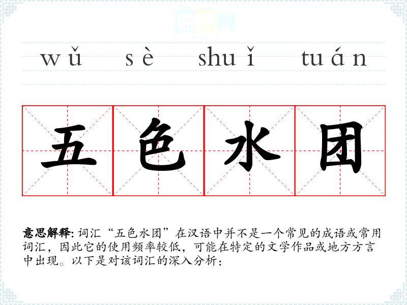 词汇“五色水团”在汉语中并不是一个常见的成语或常用词汇,因此它的使用频率较低,可能在特定的文学作品或地方方言中出现。以下是对该词汇的深入分析: