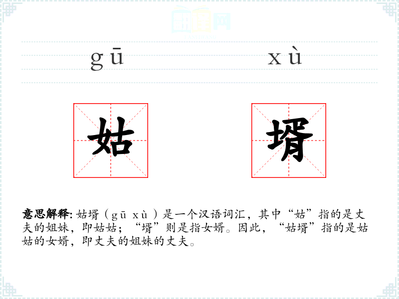 姑壻(gū xù)是一个汉语词汇,其中“姑”指的是丈夫的姐妹,即姑姑;“壻”则是指女婿。因此,“姑壻”指的是姑姑的女婿,即丈夫的姐妹的丈夫。