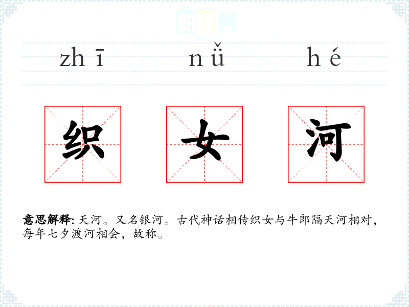 天河。又名银河。古代神话相传织女与牛郎隔天河相对,每年七夕渡河相会,故称。