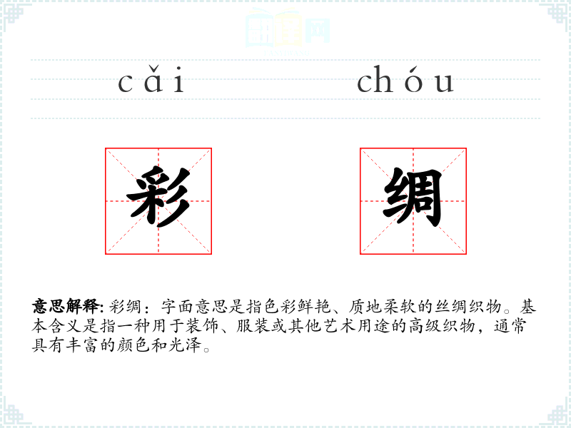 - 词源:彩绸一词由“彩”和“绸”组成,“彩”指颜色,“绸”指丝绸。在**古代,丝绸是一种珍贵的纺织品,彩绸则是丝绸中的精品。