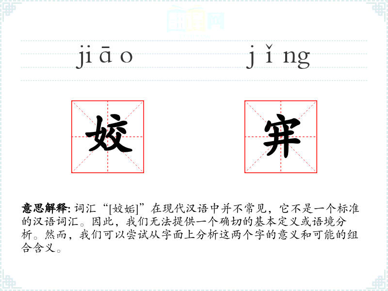 词汇“[姣姤]”在现代汉语中并不常见,它不是一个标准的汉语词汇。因此,我们无法提供一个确切的基本定义或语境分析。然而,我们可以尝试从字面上分析这两个字的意义和可能的组合含义。