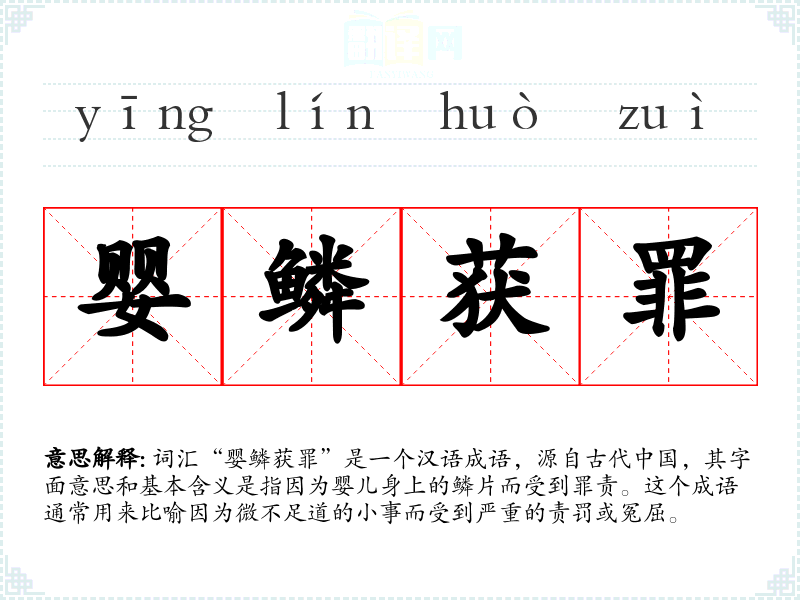 “婴鳞获罪”字面意思是指因为婴儿身上的鳞片而受到罪责。在现代汉语中,这个成语通常用来比喻因为微不足道的小事而受到严重的责罚或冤屈。