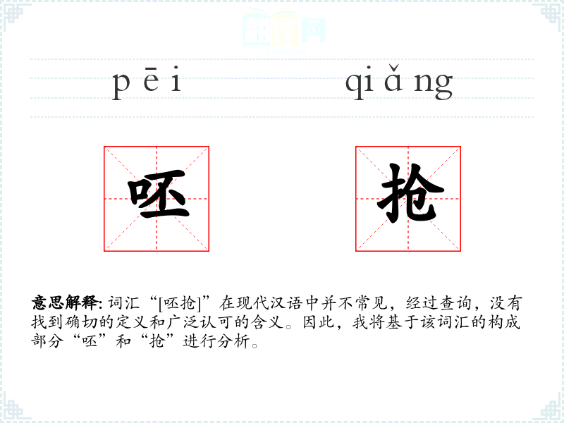 “[呸抢]”不是一个标准词汇,因此对其的分析更多是基于其构成部分的推测。在语言学习和表达中,了解词汇的构成和可能的含义有助于我们更好地理解和使用语言。