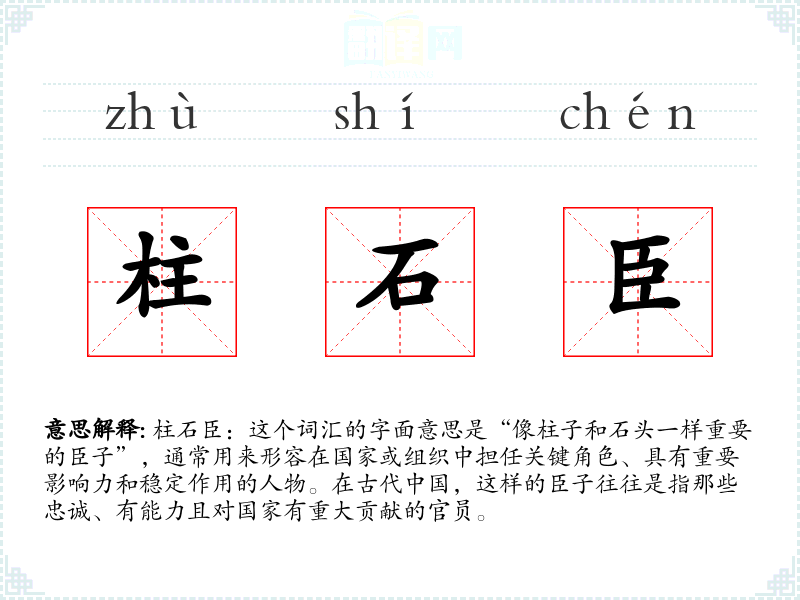 柱石臣:这个词汇的字面意思是“像柱子和石头一样重要的臣子”,通常用来形容在国家或组织中担任关键角色、具有重要影响力和稳定作用的人物。在古代**,这样的臣子往往是指那些忠诚、有能力且对国家有重大贡献的官员。
