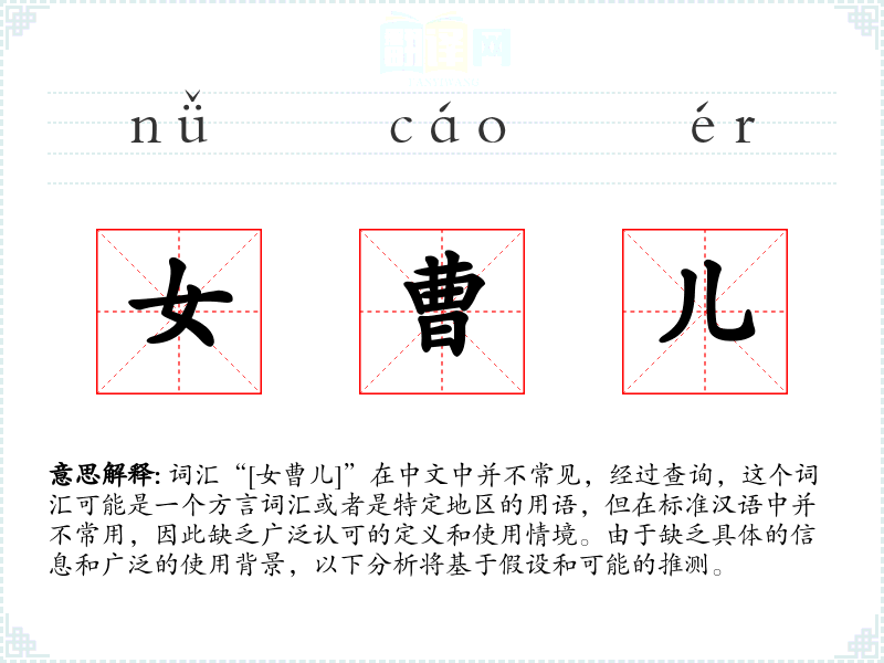 由于“[女曹儿]”不是一个标准汉语词汇,我们无法提供一个确切的定义和使用情境。这个词汇的分析表明,语言学习中遇到不常见的词汇时,需要更多的背景信息和上下文来理解其意义和用法。在语言学习和表达中,了解词汇的来源和使用背景是非常重要的。
