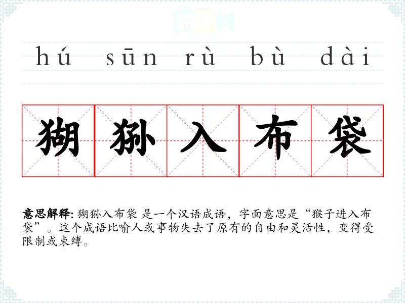 猢狲入布袋 是一个汉语成语,字面意思是“猴子进入布袋”。这个成语比喻人或事物失去了原有的自由和灵活性,变得受限制或束缚。