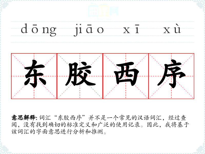 “东胶西序”字面意思可以理解为“东边的胶着,西边的秩序”。这里的“胶”可能指的是某种粘稠、不易移动的状态,而“序”则通常指秩序、顺序。整体上,这个词汇可能描述的是一种东西两方状态的对比,一方处于停滞或粘滞状态,另一方则是有序或井然有序。