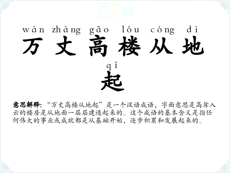 “万丈高楼从地起”是一个汉语成语,字面意思是高耸入云的楼房是从地面一层层建造起来的。这个成语的基本含义是指任何伟大的事业或成就都是从基础开始,逐步积累和发展起来的。