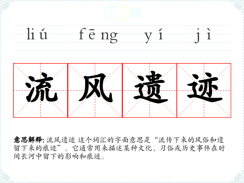 流风遗迹 这个词汇源自古代汉语,其中“流风”指的是流传下来的风俗或*惯,“遗迹”则是指留下的痕迹或遗物。随着时间的推移,这个词汇的含义逐渐固定,成为描述历史和文化传承的常用词汇。