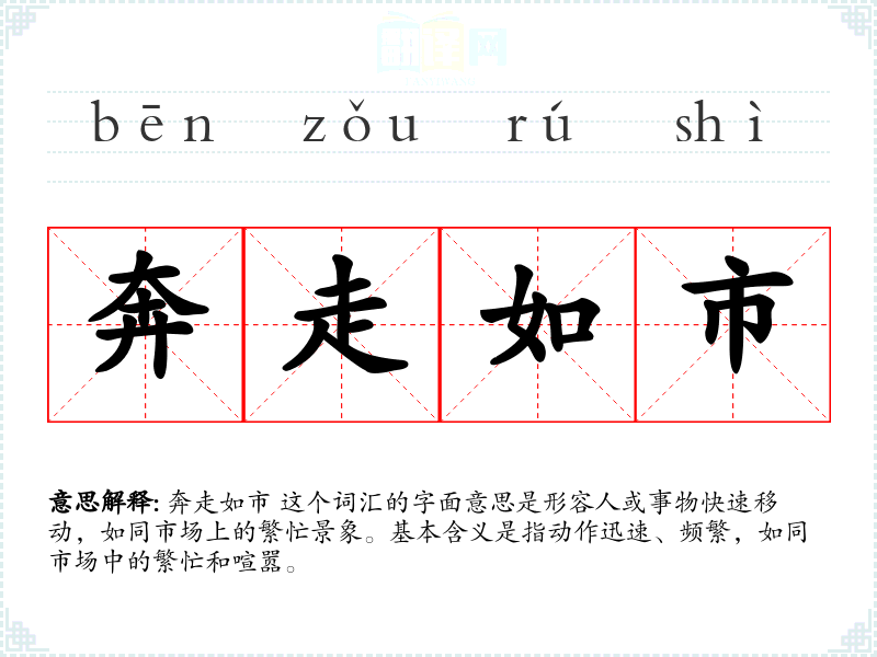 奔走如市 这个词汇的字面意思是形容人或事物快速移动,如同市场上的繁忙景象。基本含义是指动作迅速、频繁,如同市场中的繁忙和喧嚣。