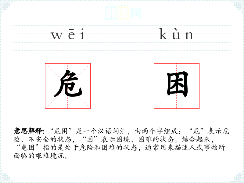 在英语中,“危困”可以对应为“in distress”或“in a predicament”,虽然表达略有不同,但都传达了困难和危险的情境。