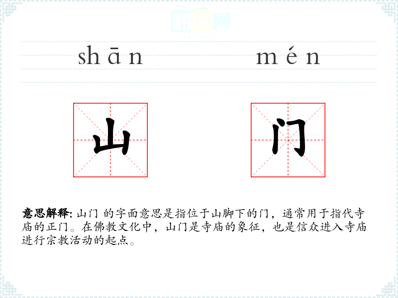 - 反义词:无(山门作为一个特定文化词汇,没有直接的反义词)
