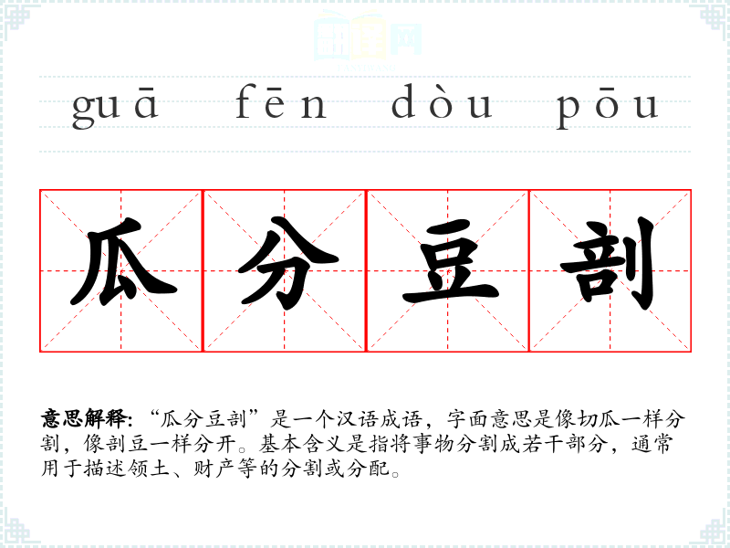 该成语的词源较为古老,源自**古代的分割土地或财产的行为。随着时间的推移,其含义逐渐固定,主要用于描述领土或财产的分割。
