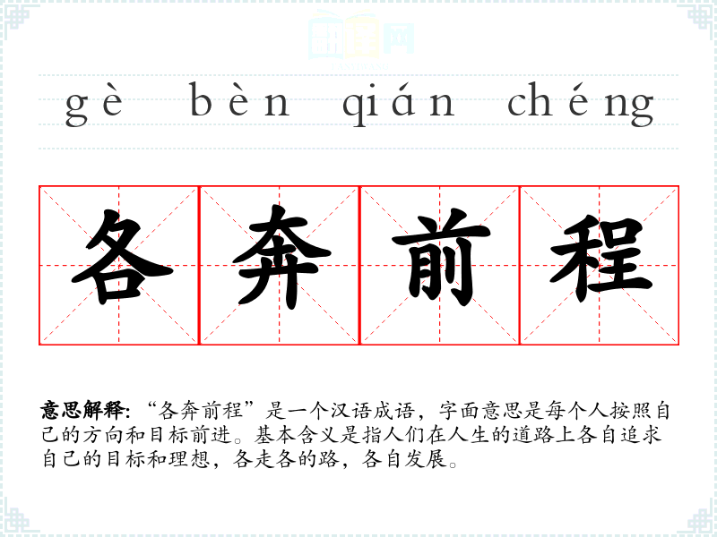 “各奔前程”是一个汉语成语,字面意思是每个人按照自己的方向和目标前进。基本含义是指人们在人生的道路上各自追求自己的目标和理想,各走各的路,各自发展。