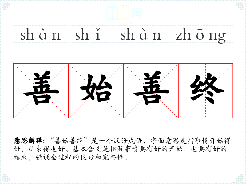 “善始善终”是一个汉语成语,字面意思是指事情开始得好,结束得也好。基本含义是指做事情要有好的开始,也要有好的结束,强调全过程的良好和完整性。