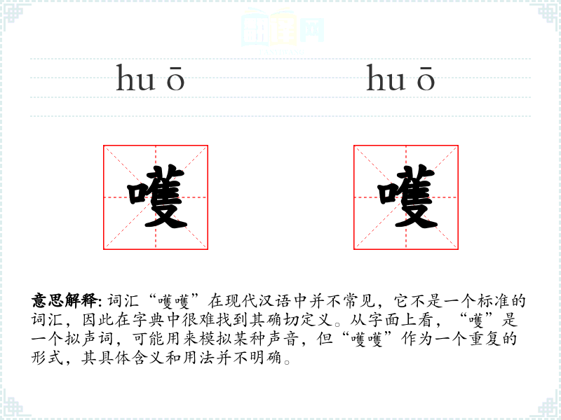 词汇“嚄嚄”在现代汉语中并不常见,它不是一个标准的词汇,因此在字典中很难找到其确切定义。从字面上看,“嚄”是一个拟声词,可能用来模拟某种声音,但“嚄嚄”作为一个重复的形式,其具体含义和用法并不明确。