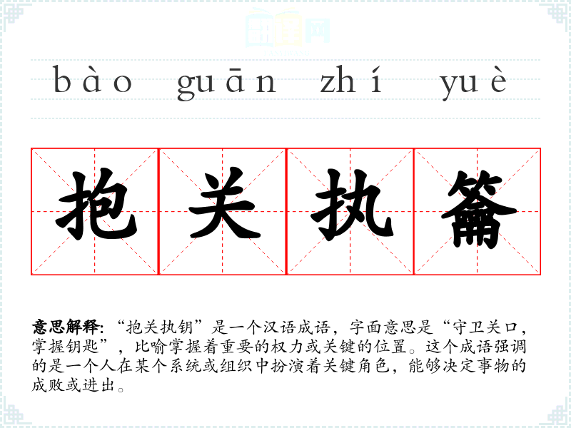 “抱关执钥”是一个汉语成语,字面意思是“守卫关口,掌握钥匙”,比喻掌握着重要的权力或关键的位置。这个成语强调的是一个人在某个系统或组织中扮演着关键角色,能够决定事物的成败或进出。