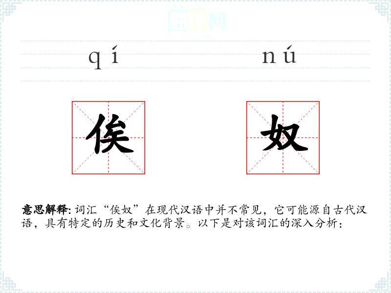 词汇“俟奴”在现代汉语中并不常见,它可能源自古代汉语,具有特定的历史和文化背景。以下是对该词汇的深入分析: