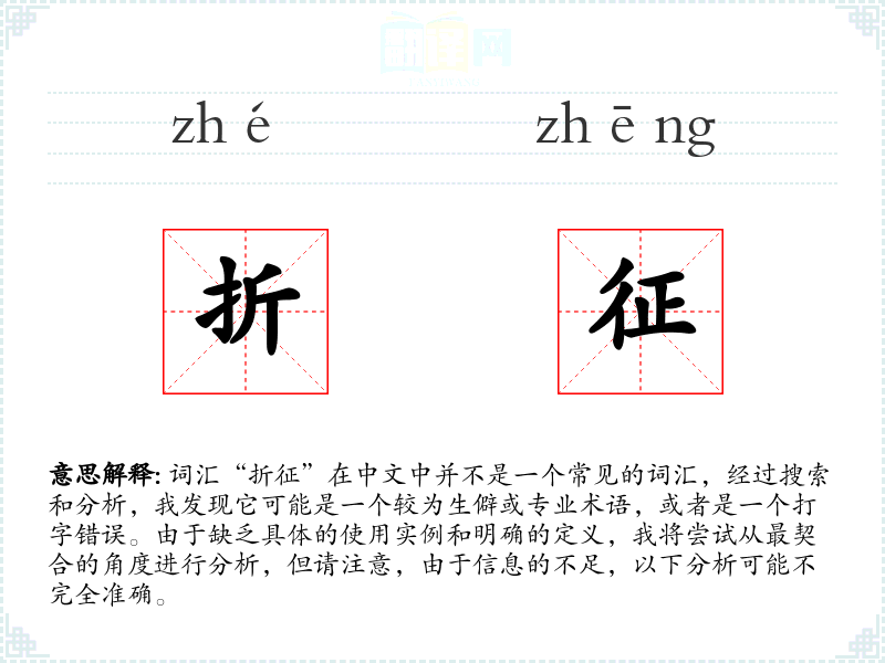 词汇“折征”在中文中并不是一个常见的词汇,经过搜索和分析,我发现它可能是一个较为生僻或专业术语,或者是一个打字错误。由于缺乏具体的使用实例和明确的定义,我将尝试从最契合的角度进行分析,但请注意,由于信息的不足,以下分析可能不完全准确。