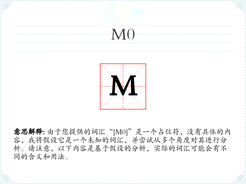 由于您提供的词汇“[M0]”是一个占位符,没有具体的内容,我将假设它是一个未知的词汇,并尝试从多个角度对其进行分析。请注意,以下内容是基于假设的分析,实际的词汇可能会有不同的含义和用法。