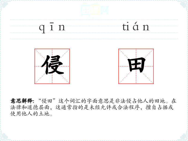 “侵田”这个词汇的字面意思是非法侵占他人的田地。在法律和道德层面,这通常指的是未经允许或合法程序,擅自占据或使用他人的土地。
