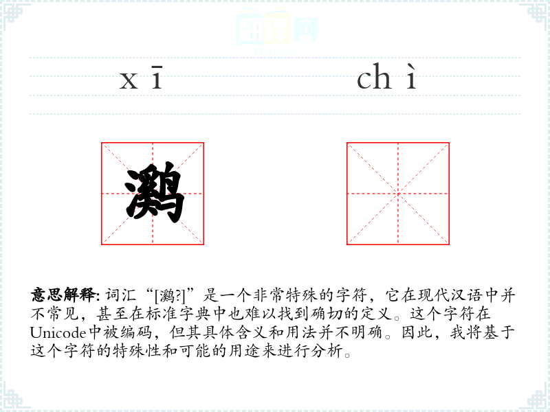 词汇“[㶉?]”是一个非常特殊的字符,它在现代汉语中并不常见,甚至在标准字典中也难以找到确切的定义。这个字符在Unicode中被编码,但其具体含义和用法并不明确。因此,我将基于这个字符的特殊性和可能的用途来进行分析。