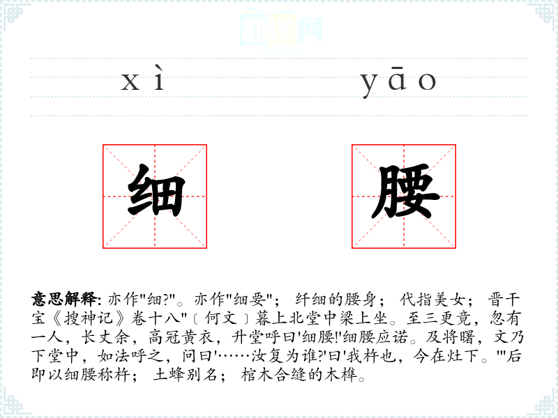 1.亦作"细?"。亦作"细要"; 纤细的腰身; 代指美女; 晋干宝《搜神记》卷十八"﹝何文﹞暮上北堂中梁上坐。至三更竟,忽有一人,长丈余,高冠黄衣,升堂呼曰'细腰!'细腰应诺。及将曙,文乃下堂中,如法呼之,问曰'……汝复为谁?'曰'我杵也,今在灶下。'"后即以细腰称杵; 土蜂别名; 棺木合缝的木榫。
