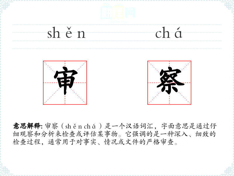审察(shěn chá)是一个汉语词汇,字面意思是通过仔细观察和分析来检查或评估某事物。它强调的是一种深入、细致的检查过程,通常用于对事实、情况或文件的严格审查。