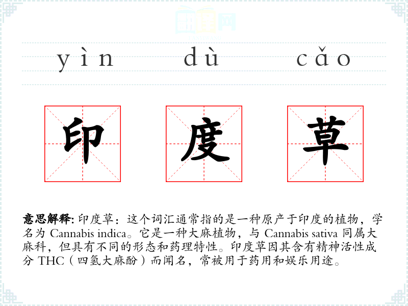- 专业领域:在医学和植物学领域,印度草可能被精确地称为 Cannabis indica,并讨论其药理作用和植物学特性。