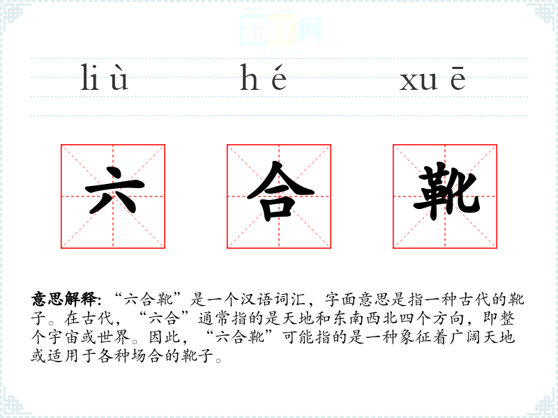 "六合靴"的意思解释、六合靴是什么意思由翻译网汉语词典查词提供。
