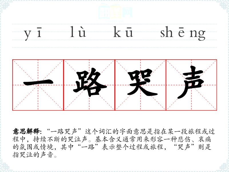 “一路哭声”这个词汇的字面意思是指在某一段旅程或过程中,持续不断的哭泣声。基本含义通常用来形容一种悲伤、哀痛的氛围或情境,其中“一路”表示整个过程或旅程,“哭声”则是指哭泣的声音。