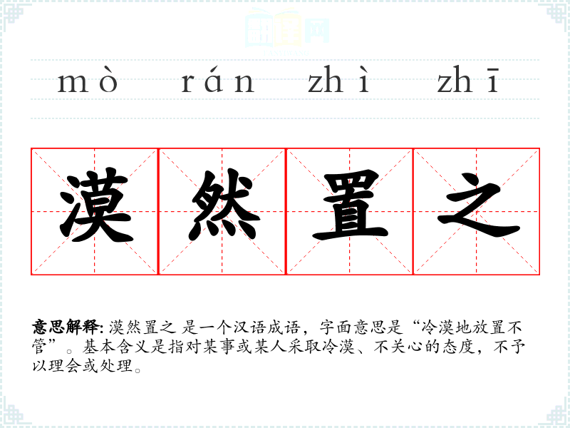 漠然置之 是一个汉语成语,字面意思是“冷漠地放置不管”。基本含义是指对某事或某人采取冷漠、不关心的态度,不予以理会或处理。