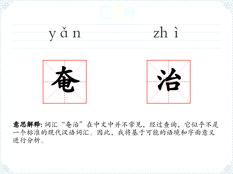 词汇“奄治”在中文中并不常见,经过查询,它似乎不是一个标准的现代汉语词汇。因此,我将基于可能的语境和字面意义进行分析。