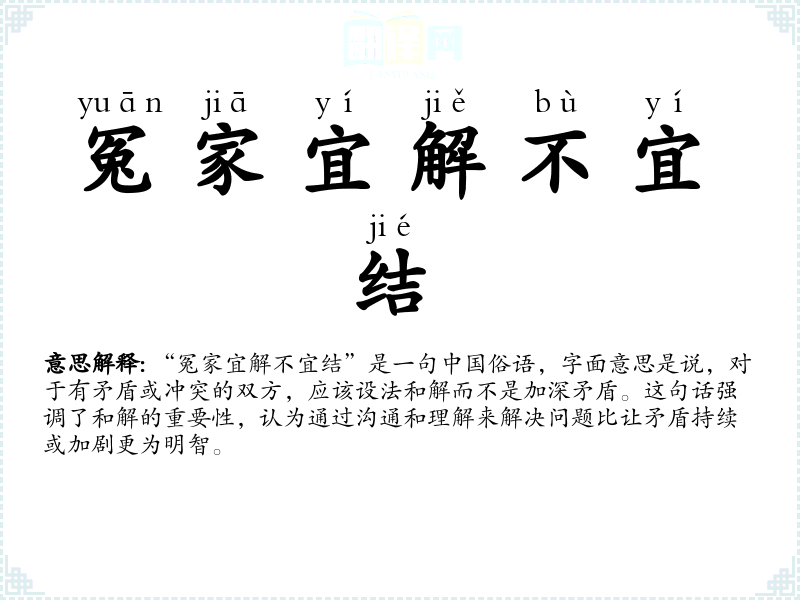 “冤家宜解不宜结”是一句**俗语,字面意思是说,对于有矛盾或冲突的双方,应该设法和解而不是加深矛盾。这句话强调了和解的重要性,认为通过沟通和理解来解决问题比让矛盾持续或加剧更为明智。