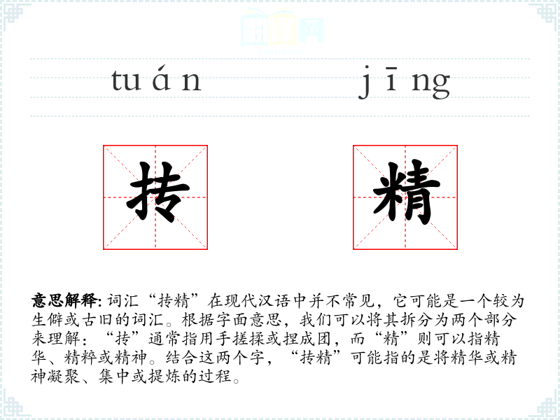 词汇“抟精”在现代汉语中并不常见,它可能是一个较为生僻或古旧的词汇。根据字面意思,我们可以将其拆分为两个部分来理解:“抟”通常指用手搓揉或捏成团,而“精”则可以指精华、精粹或精神。结合这两个字,“抟精”可能指的是将精华或精神凝聚、集中或提炼的过程。