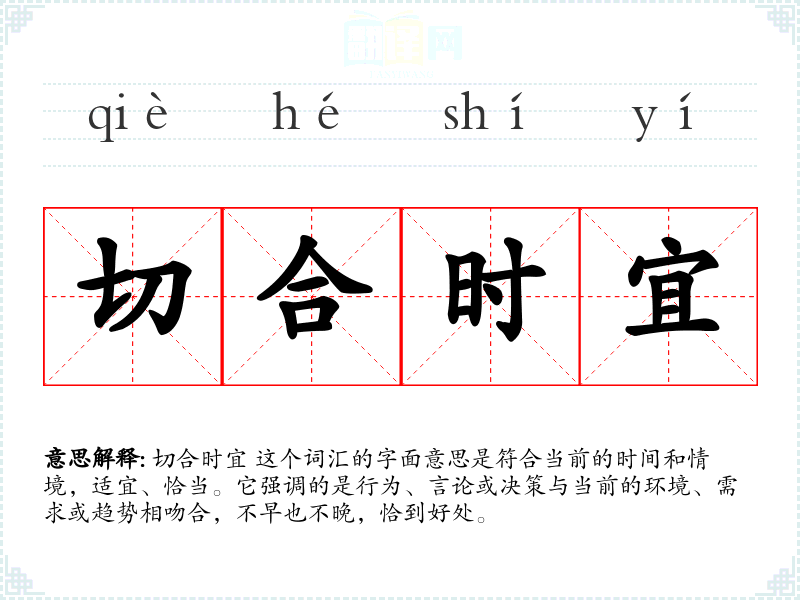 切合时宜 这个词汇的字面意思是符合当前的时间和情境,适宜、恰当。它强调的是行为、言论或决策与当前的环境、需求或趋势相吻合,不早也不晚,恰到好处。