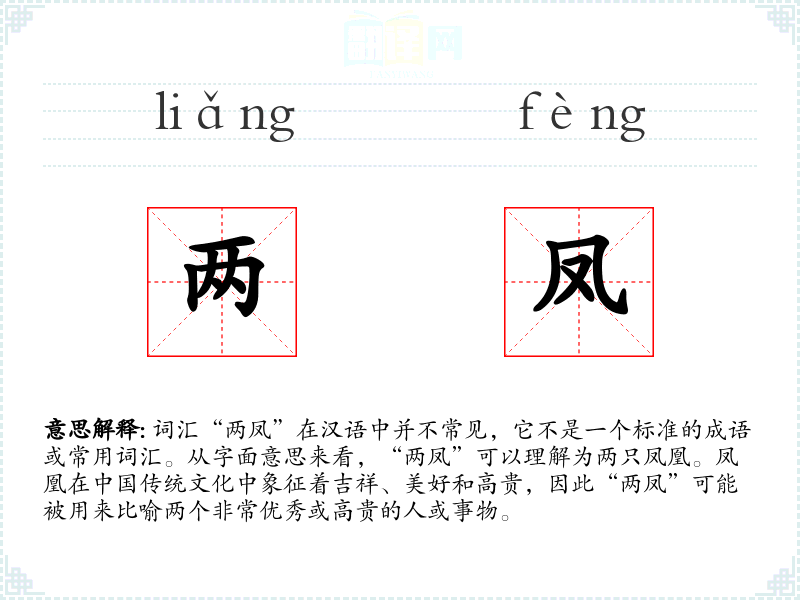 - 词源:“两凤”由“两”和“凤”组成,其中“凤”源自古代神话中的神鸟凤凰。