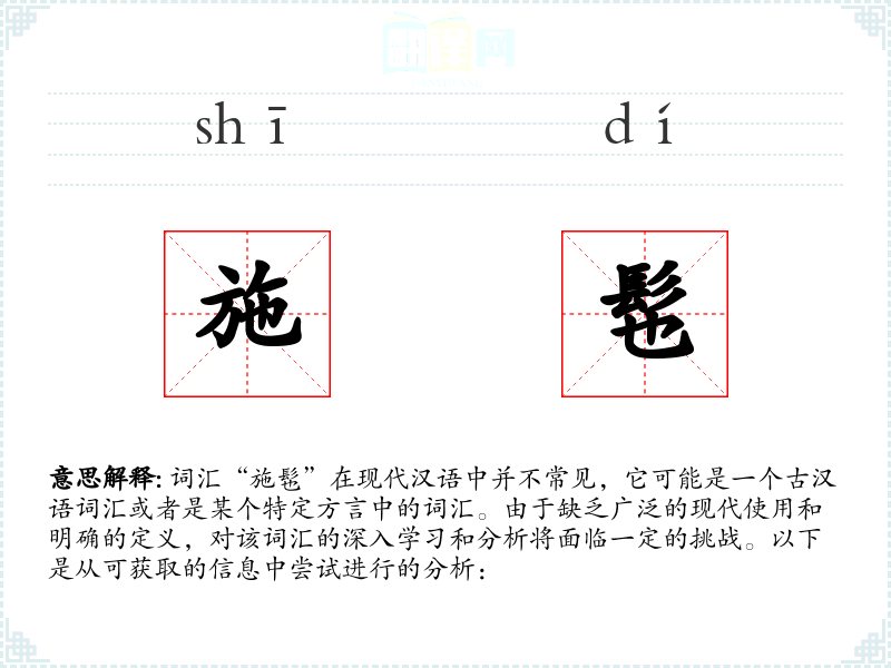 词汇“施髢”在现代汉语中并不常见,它可能是一个古汉语词汇或者是某个特定方言中的词汇。由于缺乏广泛的现代使用和明确的定义,对该词汇的深入学习和分析将面临一定的挑战。以下是从可获取的信息中尝试进行的分析: