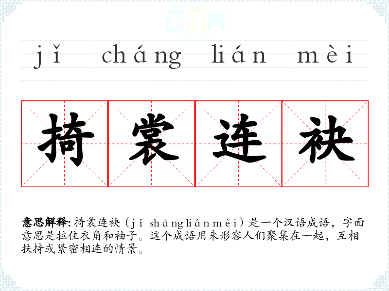 掎裳连袂(jǐ shāng lián mèi)是一个汉语成语,字面意思是拉住衣角和袖子。这个成语用来形容人们聚集在一起,互相扶持或紧密相连的情景。
