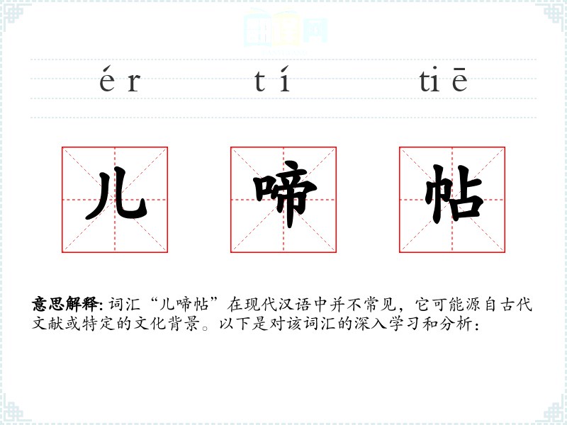 词汇“儿啼帖”在现代汉语中并不常见,它可能源自古代文献或特定的文化背景。以下是对该词汇的深入学*和分析: