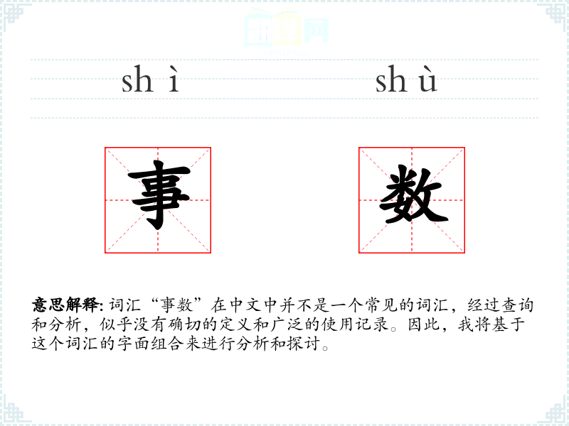词汇“事数”在中文中并不是一个常见的词汇,经过查询和分析,似乎没有确切的定义和广泛的使用记录。因此,我将基于这个词汇的字面组合来进行分析和探讨。