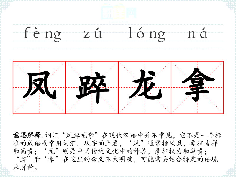 由于“凤踤龙拿”不是一个标准词汇,我们无法给出确切的基本定义。它可能是某个特定领域或方言中的词汇,或者是某个文学作品中的创造性用法。