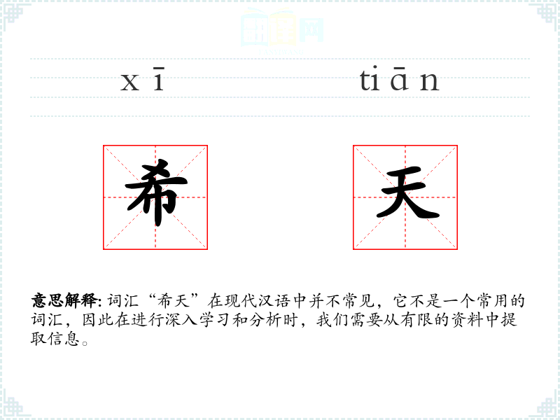 词汇“希天”在现代汉语中并不常见,它不是一个常用的词汇,因此在进行深入学*和分析时,我们需要从有限的资料中提取信息。