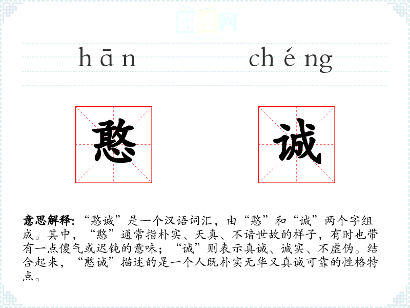 “憨”字在古代汉语中已有记载,最初可能与“痴”或“愚”有关,后来逐渐演变为描述人的性格特征。“诚”字则一直与真诚、诚实相关。两个字结合成“憨诚”,可能是近代汉语中逐渐形成的词汇,用以更准确地描述一种特定的性格特质。