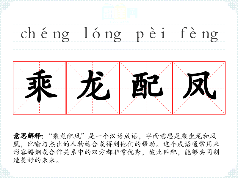 “乘龙配凤”是一个汉语成语,字面意思是乘坐龙和凤凰,比喻与杰出的人物结合或得到他们的帮助。这个成语通常用来形容婚姻或合作关系中的双方都非常优秀,彼此匹配,能够共同创造美好的未来。
