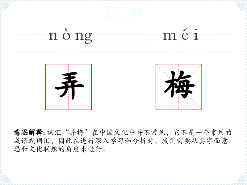词汇“弄梅”在*文化中并不常见,它不是一个常用的成语或词汇,因此在进行深入学和分析时,我们需要从其字面意思和文化联想的角度来进行。